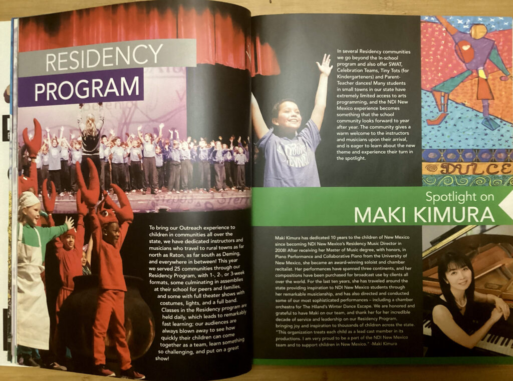In New Mexico, she worked with the National Dance Institute of New Mexico (NDI-NM) for fourteen years. Until she was appointed to a teaching position at University of New Mexico - Gallup, she served as a Residency Music Director and has extensively toured throughout the state of New Mexico. She has done over 260 weeks of tours in ten years to bring their award-winning dance program to over 22,000 young people, then she was appointed as Albuquerque Associate Music Director. She music-directed dance events of the Hiland Program and worked with world-acclaimed artists such as Ann Reinking and Evelyn Cisneros-Legate.