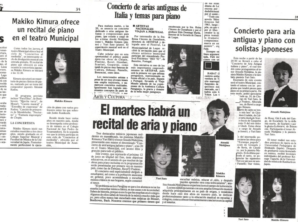 She listlessly continued her piano study at Nihon University College of Art. One day in her senior year, she came across a recruitment advertisement to the Ministry of Foreign Affairs’ overseas technical cooperation program. Hoping to change her dreary life, she jumped at the opportunity and was dispatched to Paraguay. While teaching music, she also played a role as cultural ambassador and gave numerous piano concerts throughout country. Completing her three-year mission, she received awards from the Japanese Ministry of Foreign Affairs and the Mayor of San Pedro for her achievement in Paraguay. This cross-cultural experience became the foundation for her later life.