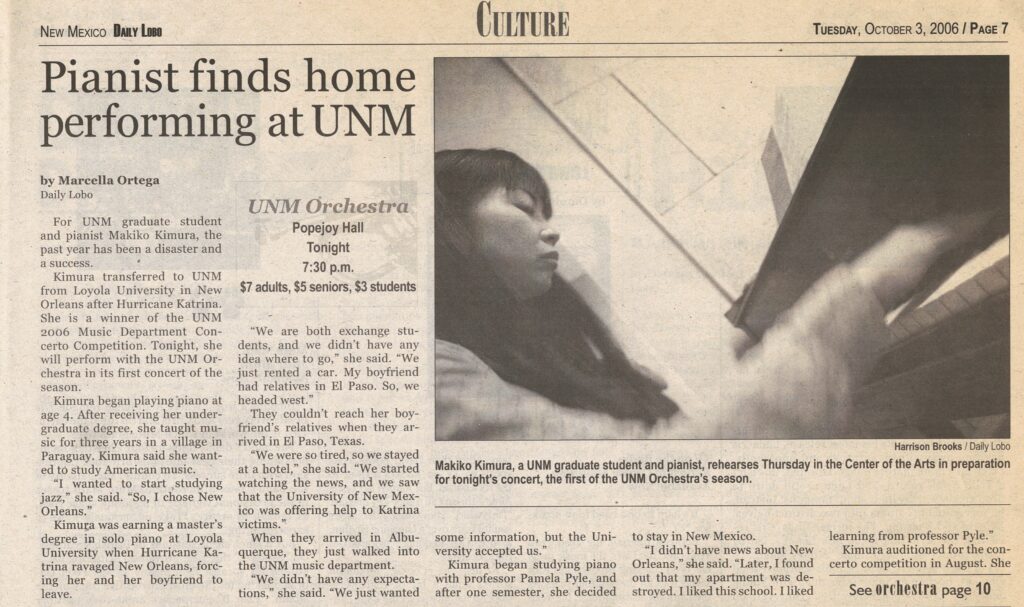 While nobody knew what would happen to New Orleans after the disaster, the University of New Mexico accepted her as a graduate assistant to continue her study. She stopped her jazz piano study and instead started collaborative piano study along with solo piano study. She was the first student in the UNM music department to achieve that dual concentration. During her school years, she won the UNM Concerto Competition and NM Creative Symposium as a solo pianist and contributed to many awards as a collaborative pianist. She received her M.M degree in both Piano Performance and Collaborative Piano, where she graduated with distinction honors. After graduating from UNM, she obtained the O-1 artist visa, which is for individuals with extraordinary ability or achievement, then the EB-1 artist green card, which is for first-preference workers with extraordinary ability in arts.